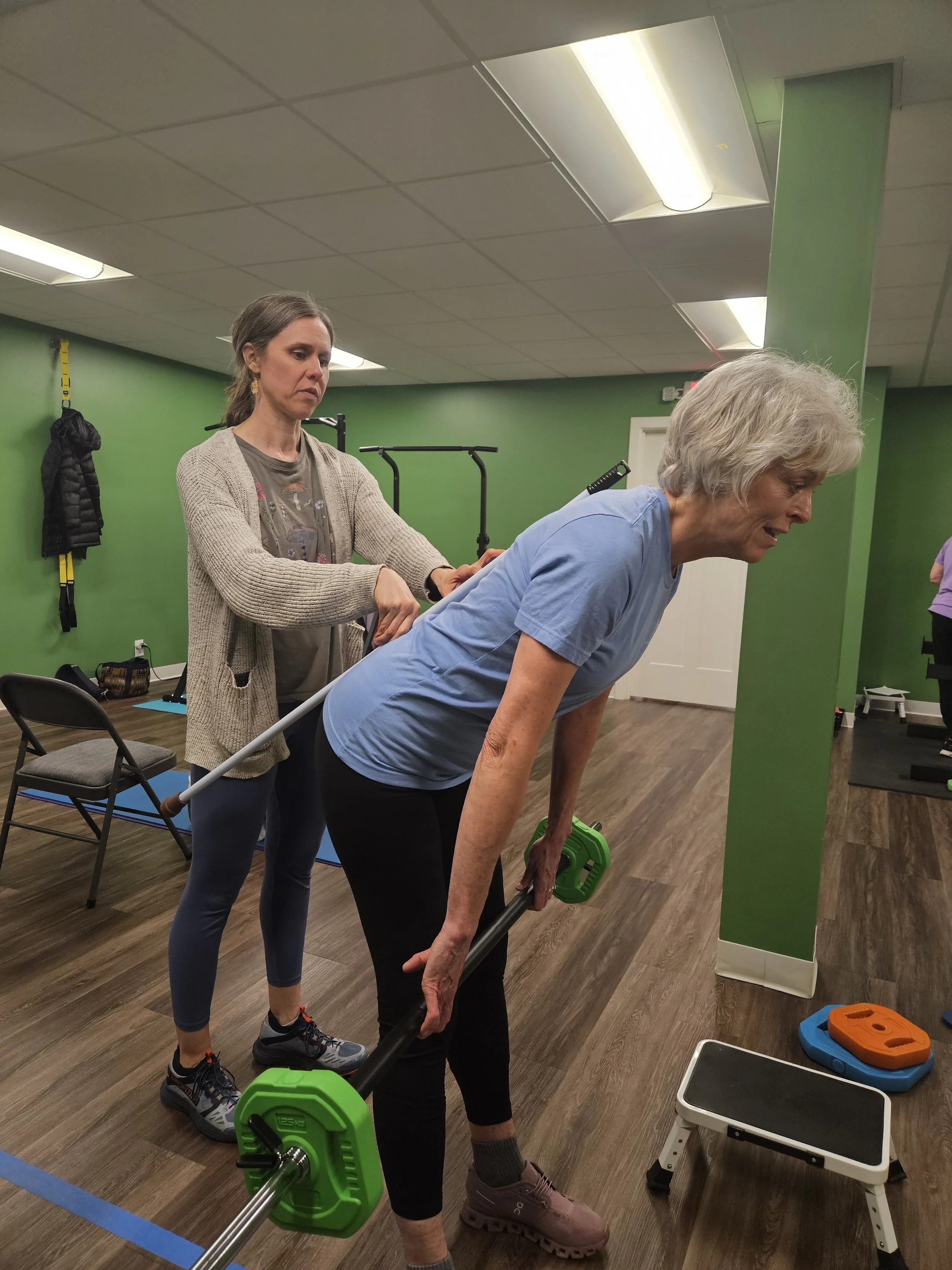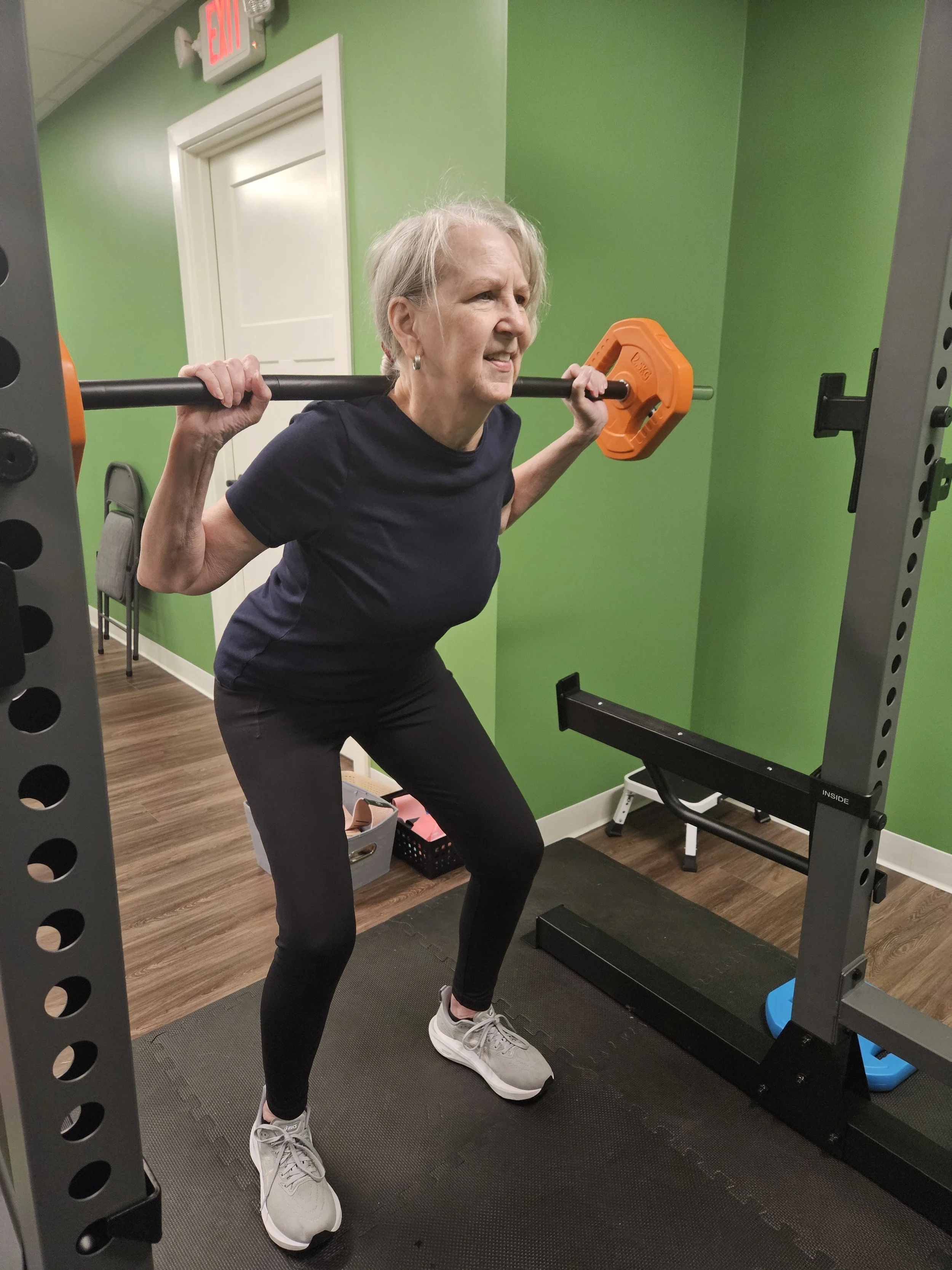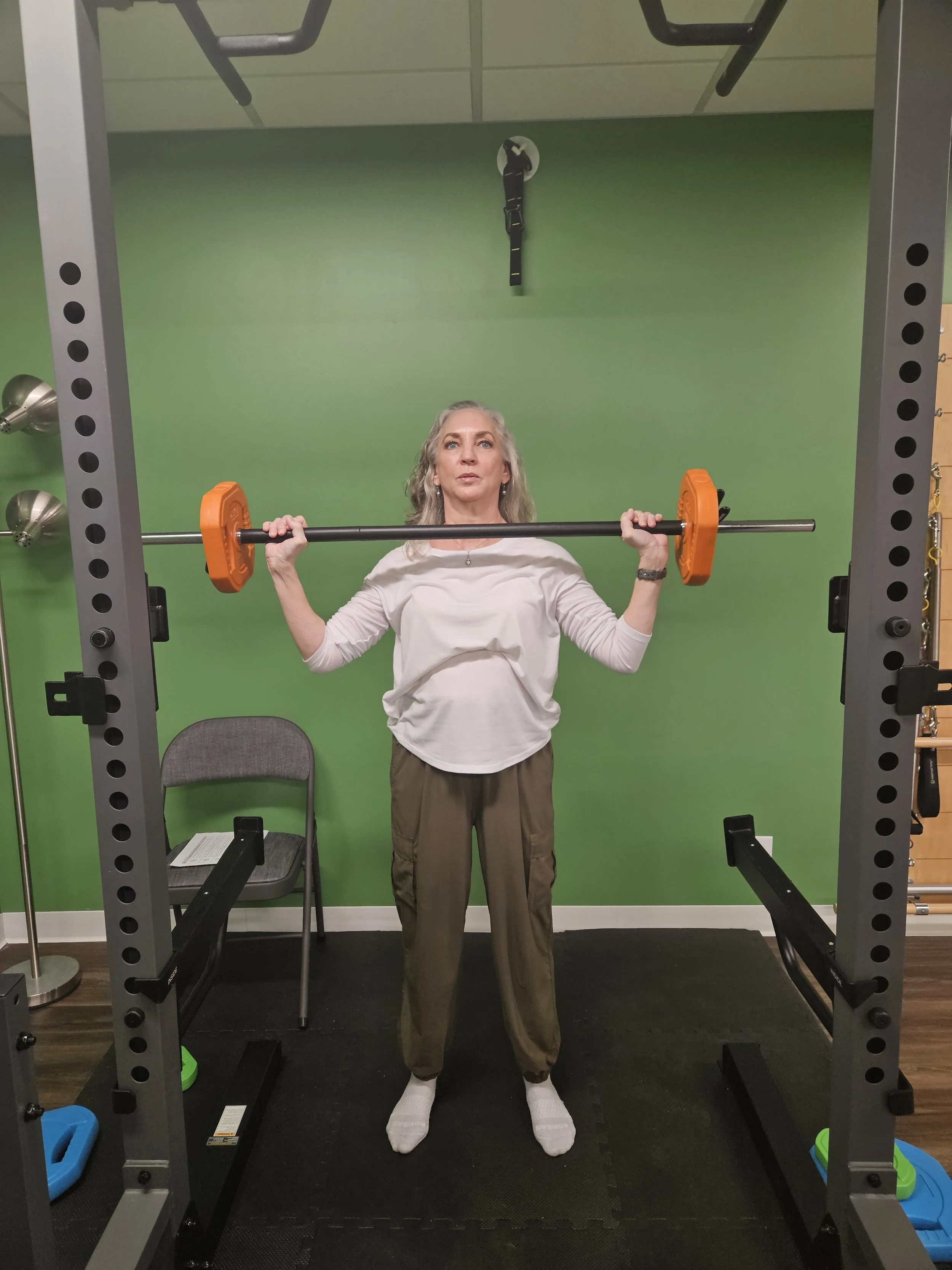 All participants must start with a 50-minute private session with the physical therapist. During the session, she will explain and demonstrate the core exercises, review your medical history related to osteopenia or osteoporosis, and complete baseline strength and balance testing for future comparison. Clients with prior experience in barbell movements like squats, deadlifts, and overhead presses may be ready to join ONERO™ classes soon after their first session. Other clients may need additional private sessions to ensure that they have the necessary coordination, spatial awareness, range of motion, and pelvic and abdominal control to participate in the group lifting routines.